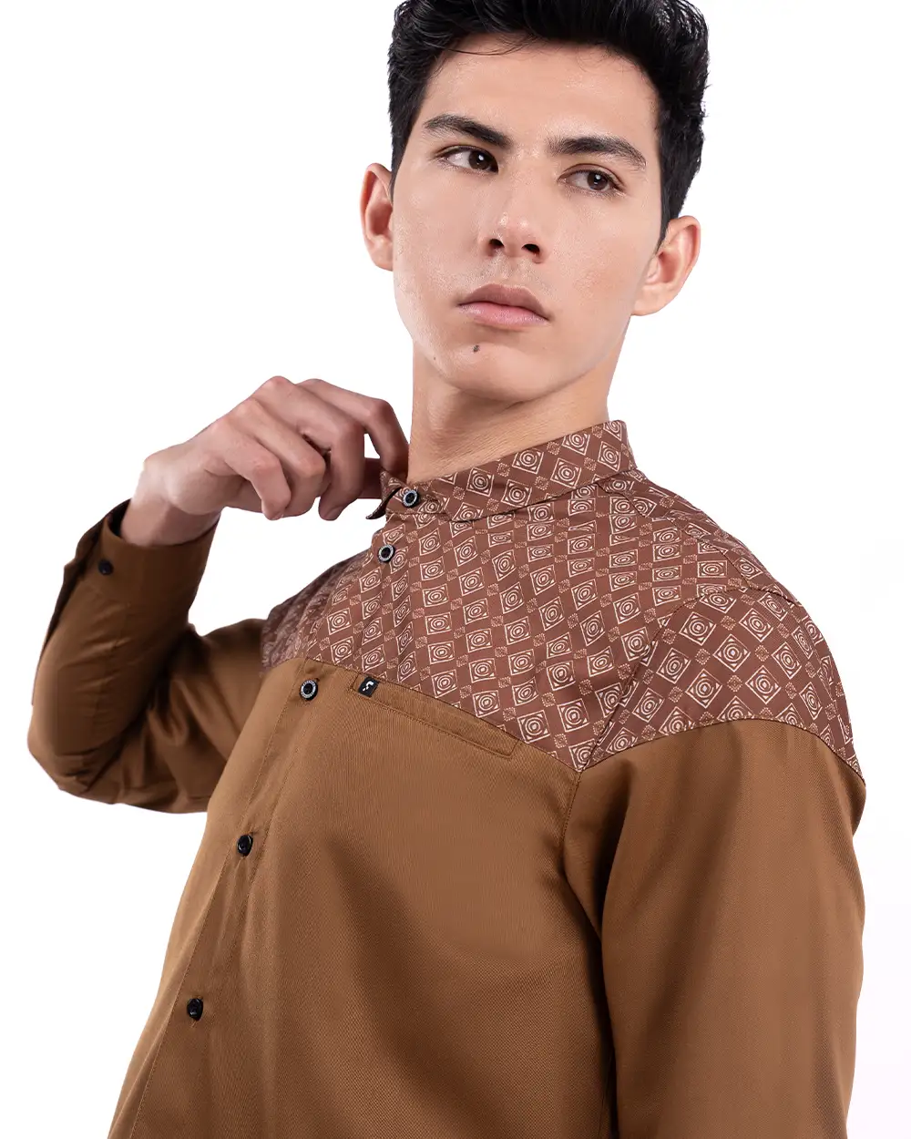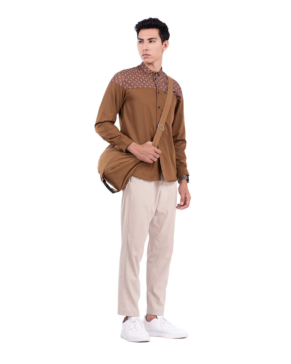 Setiap elemen geometris tersusun padat dan harmonis, mencerminkan keseimbangan antara keteguhan dan ketenangan. Balutan warna copper menghadirkan kesan hangat, berkelas, dan berkarakter. Penampilan ini bikin lebih percaya diri dengan look elegan yang tegas dan maskulin.