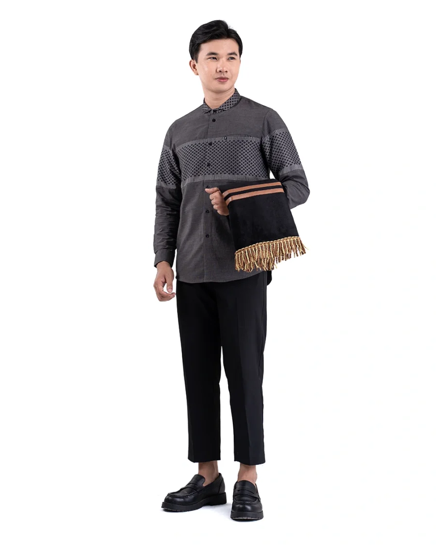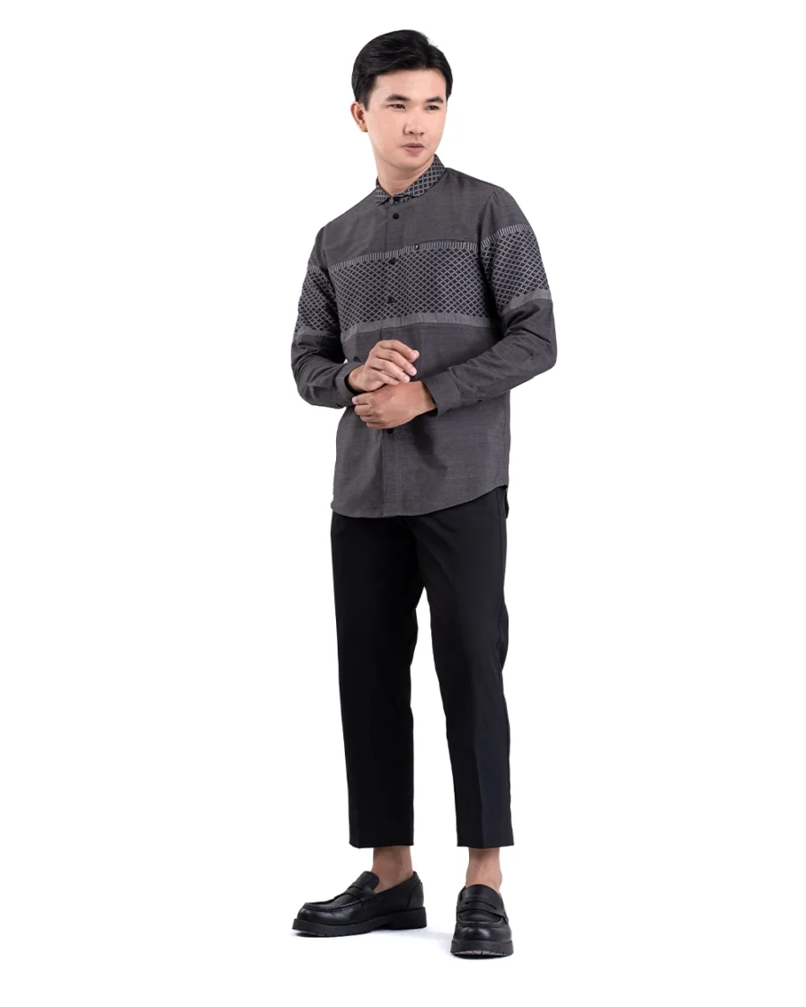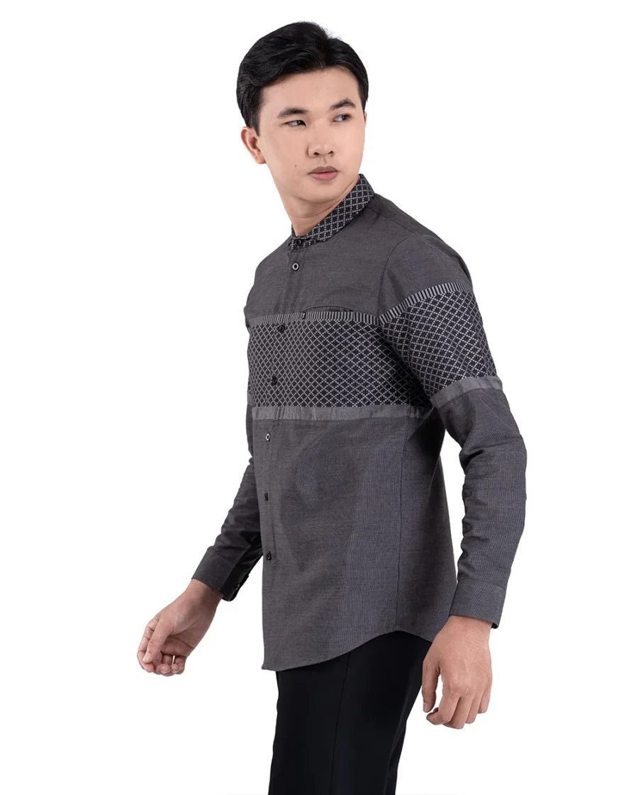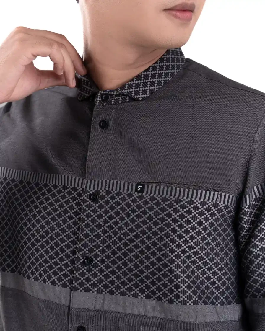 Koko Modern Elegan warna grey dengan kombinasi motif line geometric dobby texture exclusive yang senada dengan warna black dengan kombinasi grey yang bertekstur timbul. Terdiri dari berbagai pola garis bebentuk belah ketupat yang disusun menjadi kesatuan yang memberi kesan keharmonisan dan kemewahan.