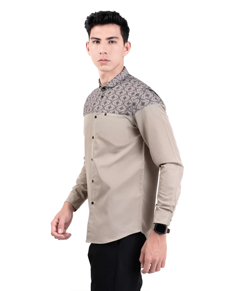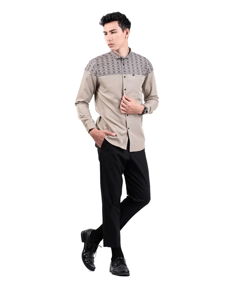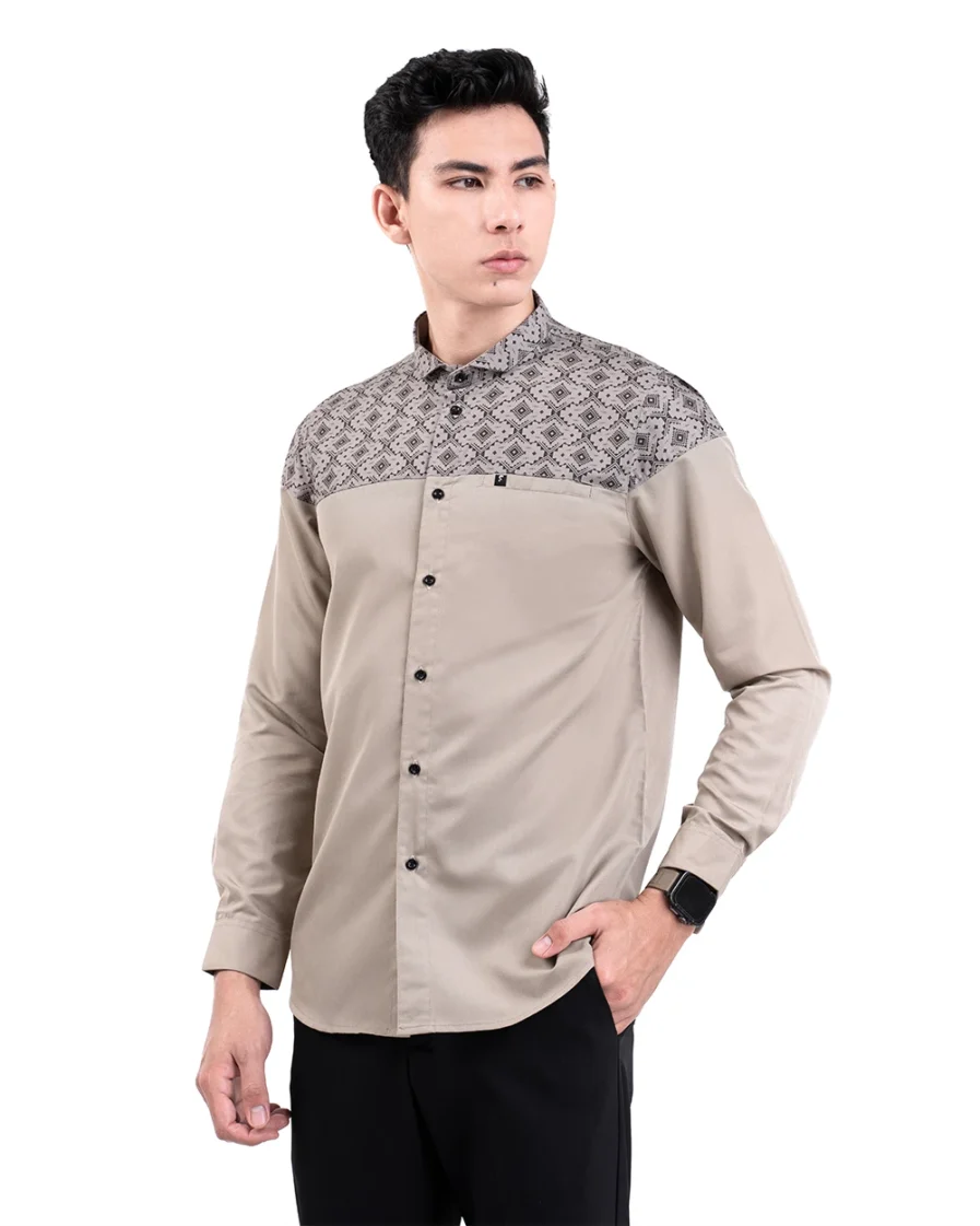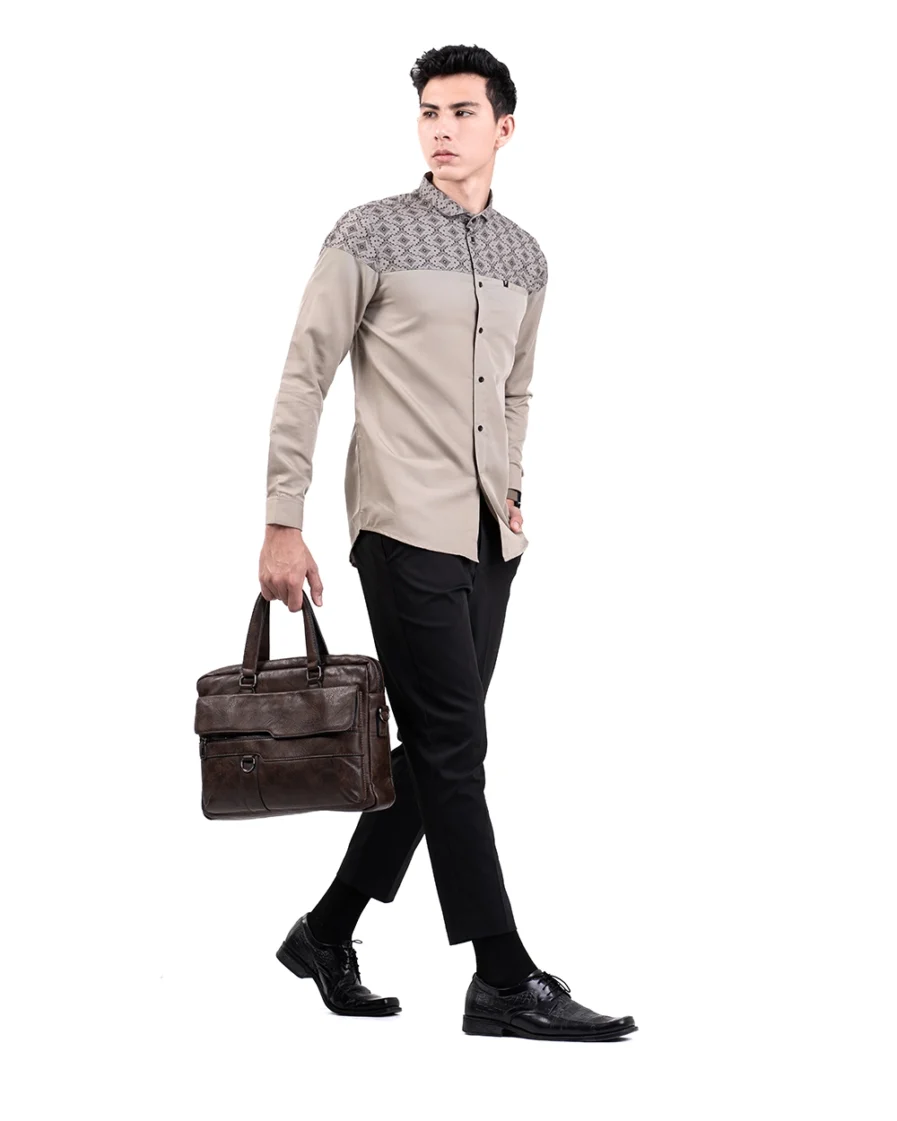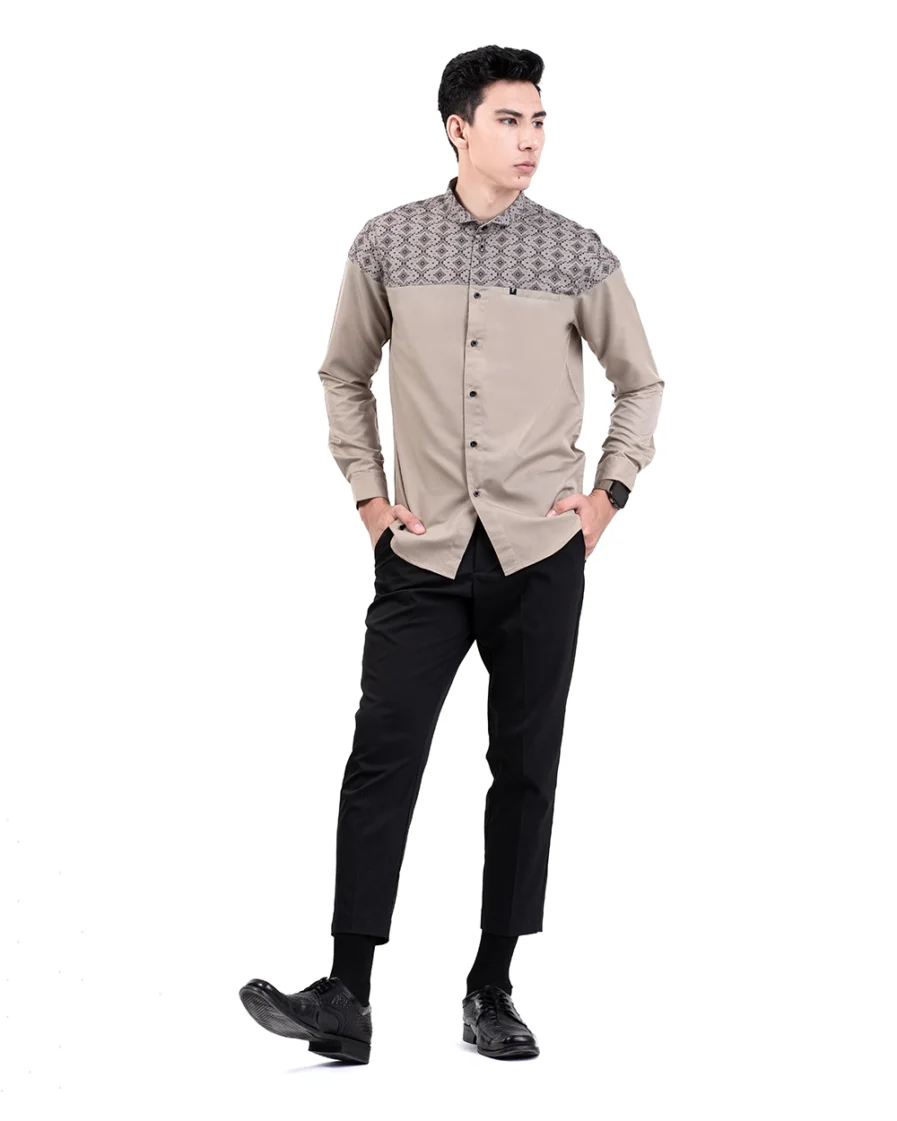 Motif tersusun rapi dengan sudut tegas yang mencerminkan keteguhan. Warna khaki yang membumi memberi kesan tenang dan kuat. Penampilan ini bikin lebih percaya diri dengan look yang tetap elegan.