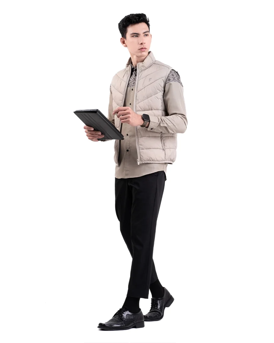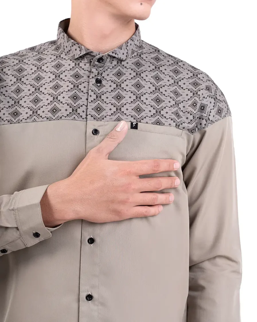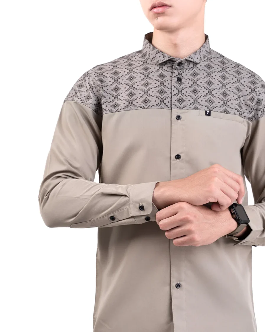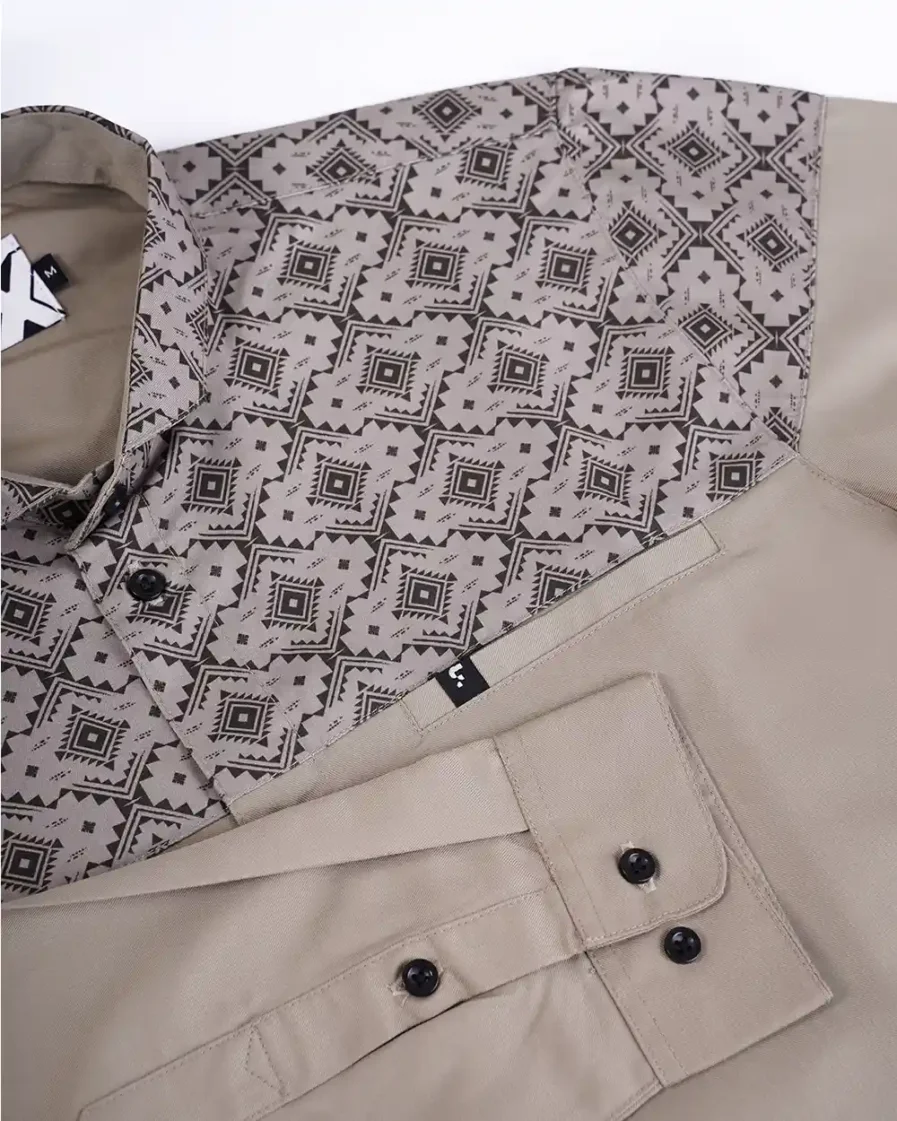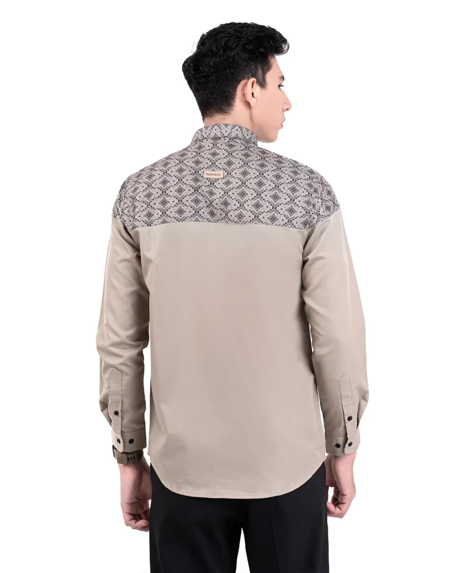 Motif tersusun rapi dengan sudut tegas yang mencerminkan keteguhan. Warna khaki yang membumi memberi kesan tenang dan kuat. Penampilan ini bikin lebih percaya diri dengan look yang tetap elegan.